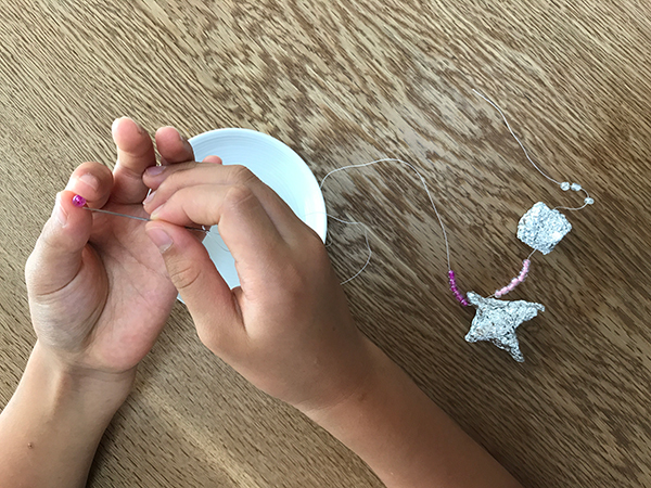 針に糸を通し、アルミホイルとビーズをつないでいく。