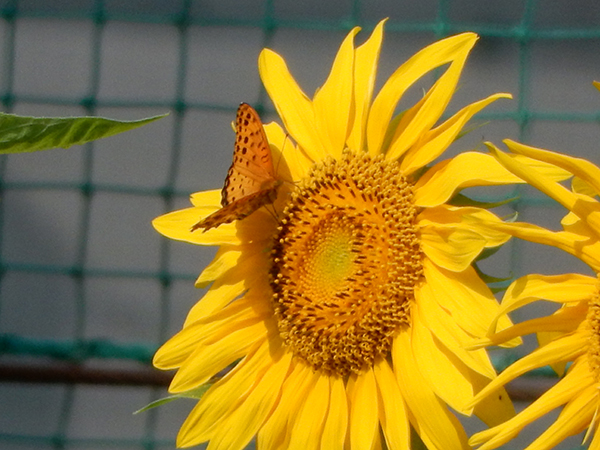 大きなひまわりに舞い降りる、オレンジ色のタテハチョウ。
