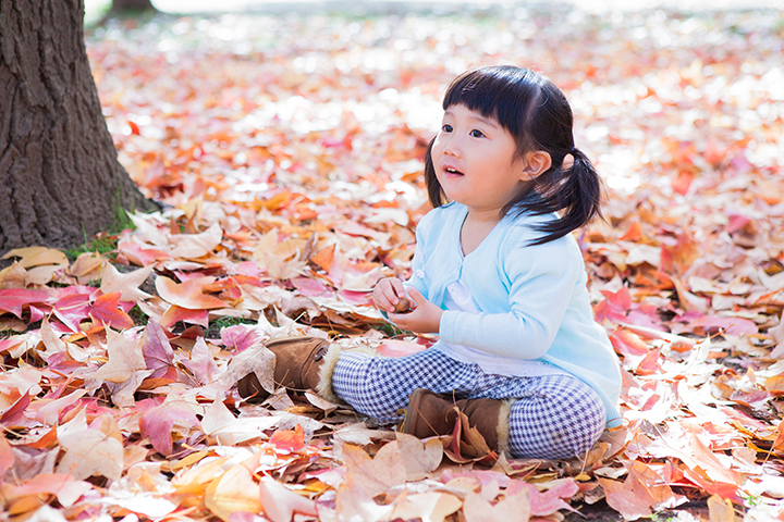 落ち葉に触れた時の音や手ざわりを通して、秋の自然に親しみ、季節への興味関心や感性を育てます。落ち葉の中に入って手指で葉っぱをつかむ、投げ上げる、かきわけるなどの動作を重ねることで、巧緻性や注意力も高められます。