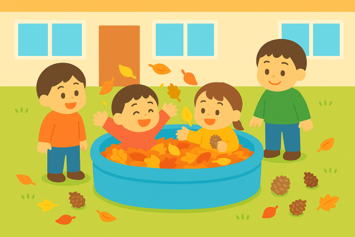 秋に集めた落ち葉やまつぼっくりなどをたっぷり入れたプールで楽しむ、感覚遊びです。子どもたちは落ち葉の中に入って全身で「シャカシャカ」「カサカサ」「パリパリ」という音や感触を楽しんだり、葉っぱを投げたりすくったりしながら遊びます。落ち葉に隠れたどんぐりを見つけるなどの発展遊びにもつながります。