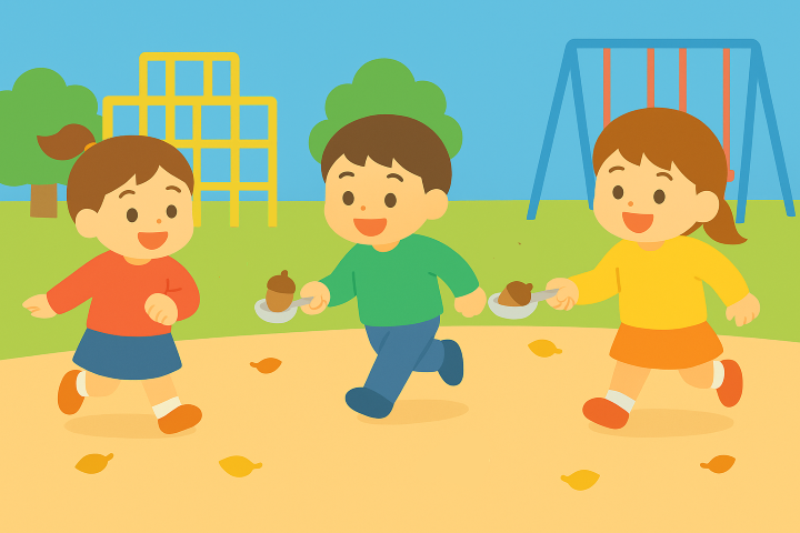 おたまやスプーンの上にどんぐりを乗せて運ぶリレー形式の遊びです。落とさないように慎重に歩いたり、友達にバトンのように渡したりと、バランス感覚や集中力が求められる活動です。運ぶ道具のサイズや運ぶ距離の調整によって、年齢や発達に応じた難易度にアレンジしやすく、戸外遊びとしても盛り上がります。