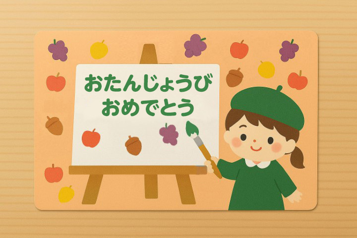 キャンバスに描かれた「おめでとう」の文字が目を引く誕生日カードです。ベレー帽をかぶった女の子が絵筆を持つイラストは芸術の秋にぴったり。女の子の帽子にフェルトを貼れば、モコモコした質感が楽しいカードにもなります。背景のモチーフを子どもが好きな動物などに変えたり、スタンプを使ったりしても良いでしょう。