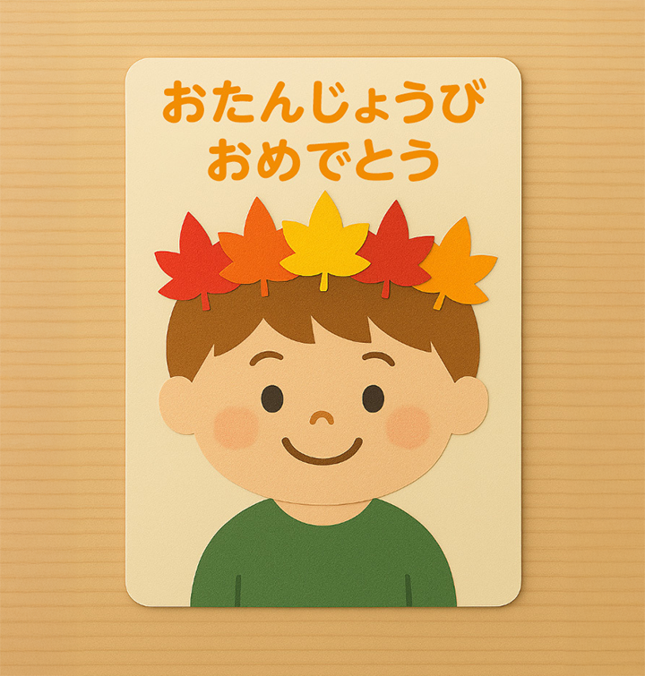 クリーム色の画用紙に、子どもの顔を大きく描いて、頭には赤・黄・オレンジの折り紙で作ったもみじの葉を並べ、かんむりのように飾ります。金色の「おめでとう」の文字が特別な1日を彩る、シンプルながらも主役感のあるカードです。
