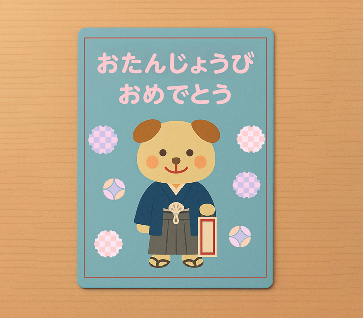 七五三を迎える年齢の子どもには、こんなカードも!和服姿の犬が、ちとせあめを手に立っている姿は、自分自身の七五三のお祝いと重なり、印象的に映ることでしょう。背景に和柄の折り紙やシールを貼って、ハレの日の華やかさを演出します。