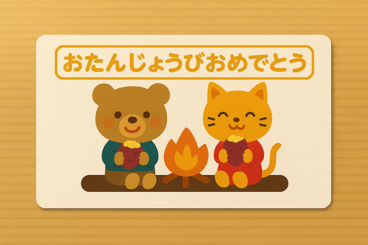 ほっこりあたたかい秋の風景をデザインした誕生日カードです。たき火の左右には、さつまいもをうれしそうに頬張るクマとネコがにっこり。子どもといっしょにこの後のお話が作れそうな、絵本の一場面を思わせるカードです。炎の部分に赤いセロファンを貼ると、ちょっとしたキラキラ感が楽しめます。