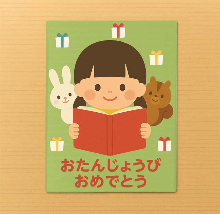 絵本を読んでいる女の子のまわりに、うさぎさんとりすさんがそっと集まってきました。みんなで仲良く絵本の世界に夢中です。本を読むことが大好きな子にぴったりの、あたたかみのあるデザインです。余った色画用紙で、本のしおりを作っていっしょにプレゼントしてあげるのもすてきですね。