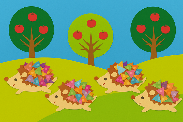 「実りの秋」「スポーツの秋」をイメージした、かわいいはりねずみたちの壁面制作です。背景にはりんごの木が並ぶ丘を画用紙で表現し、はりねずみの背中のトゲは色とりどりの折り紙を貼って表現しています。元気いっぱいに走る姿が、物語のワンシーンのよう。背中のトゲはちぎり絵やシールを使っても楽しく表現できます。
