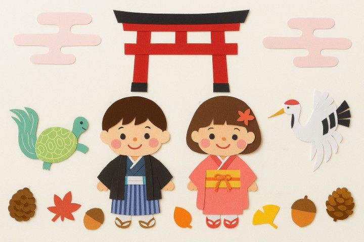 七五三は、子どもたちの健やかな成長を願う大切な行事。鳥居の下でにっこり笑う子どもたちのまわりには、長生きやしあわせのしるし「鶴と亀」、そして秋の自然がいっぱい。和のテイストがおめでとうの気持ちを伝える、あたたかい壁面デザインです。