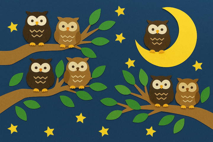 夜の森に集まったふくろうたちのパーティーをイメージした壁面制作です。背景は紺色の画用紙をベースに、お月さまや星を貼り付けてにぎやかに。「みんな集まっているね!」「パーティーで何をするのかな?」など、子どもたちの想像もふくらみます。枝にとまったふくろうたちは、色画用紙で作り、1羽ずつ表情や模様を変えても楽しめます。夜に活動するふくろうの特性を知り、子どもたちの自然への興味を育むきっかけにもなる壁面です。