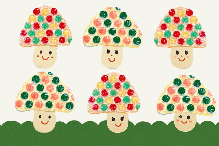 秋の味覚のきのこたちが表情豊かに並ぶ、ポップで楽しい壁面制作です。かさの部分にはプチプチ素材(気泡緩衝材)を使い、マジックでカラフルに色付け。フワフワしたプチプチに色を塗る感触や、自分なりの色使いの配列などの工夫が楽しめます。軸には、にっこり笑顔やウインクなど、自由に表情を描けば見ているだけで楽しくなるきのこが大集合。素材の面白さと季節感を同時に楽しめるアイデアです。