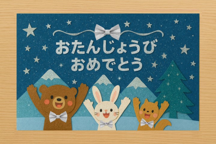 たくさんの星が、澄んだ冬の空に輝く夜。雪がつもる山々から、動物たちがお祝いにかけつけてくれました。青の同系色の色画用紙を貼って山々を表現し、空に銀色の折り紙を切り抜いた星をちりばめます。動物たちの胸に飾られた蝶ネクタイは光沢のあるパール紙やグリッター折り紙を使い、落ち着いた色彩のカードを華やかに。「おたんじょうびおめでとう」の文字に接着剤を塗り、ラメを振りかけてキラキラの文字にするのもすてきです。