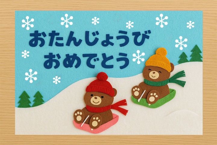 雪の中をそりですべるクマたちがかわいらしい、冬らしさいっぱいの誕生日カードです。水色と白の画用紙を重ねて雪の斜面を表現し、帽子やマフラーをつけたクマをフェルトや色画用紙で仕上げます。毛糸の帽子のてっぺんに、小さなポンポンを付けても立体的で楽しいカードになります。背景には斜面に沿ってもみの木を貼り、スタンプやシールで雪の結晶を散らしましょう。寒い冬でも思い切り遊ぶクマたちの楽しそうな様子に、ぽかぽかと気持ちが温まるような、そんなカードです。