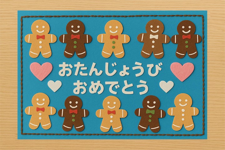 冬のお誕生日のお祝いにぴったりの、見ているだけでクッキーの香りがしてきそうな楽しいカードです。