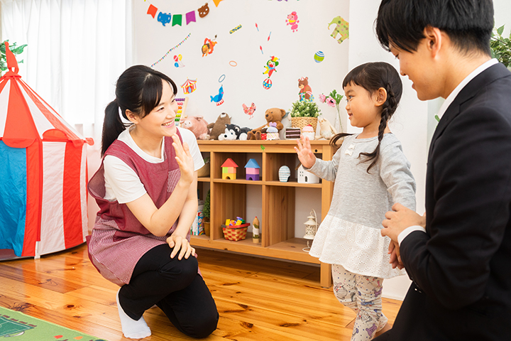 A. 実習生の立場では、個人的な会話や子どもの家庭のことには触れないようにしましょう。登降園時は「おはようございます」「今日もよろしくお願いいたします」など、挨拶と簡単なやりとりにとどめます。質問や相談を受けた場合は、必ず担当保育士に報告をしましょう。