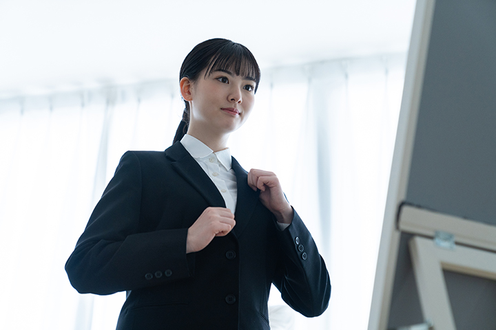 髪は顔まわりがすっきり見えるように整え、アクセサリー類は付けません。靴は歩きやすく、控えめなデザインを選びます。