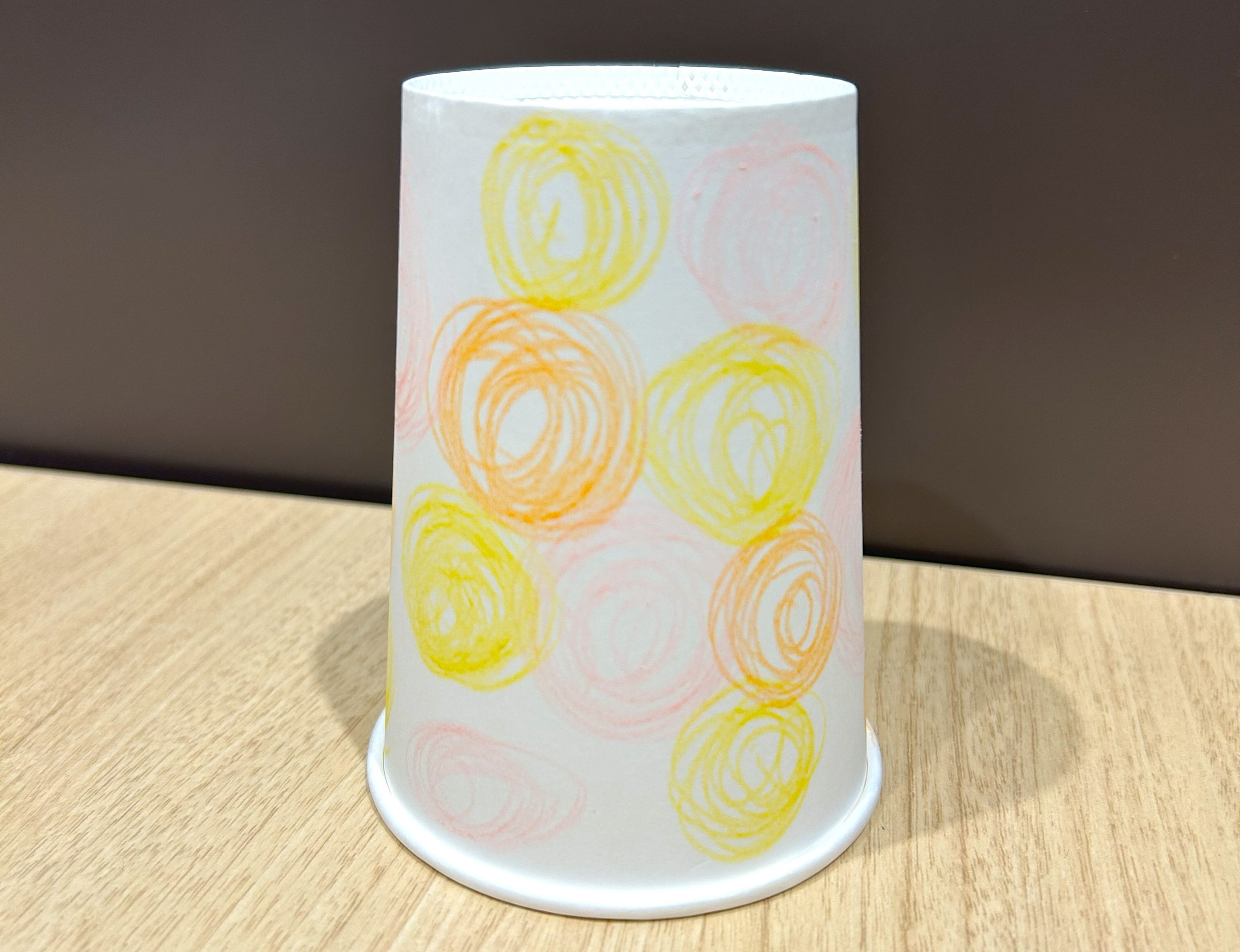紙コップ、色画用紙(黄、黒、赤、白)、色鉛筆・カラーペンなど、はさみ、セロハンテープ、木工用接着剤、穴あけパンチ、丸ゴム(黒)
