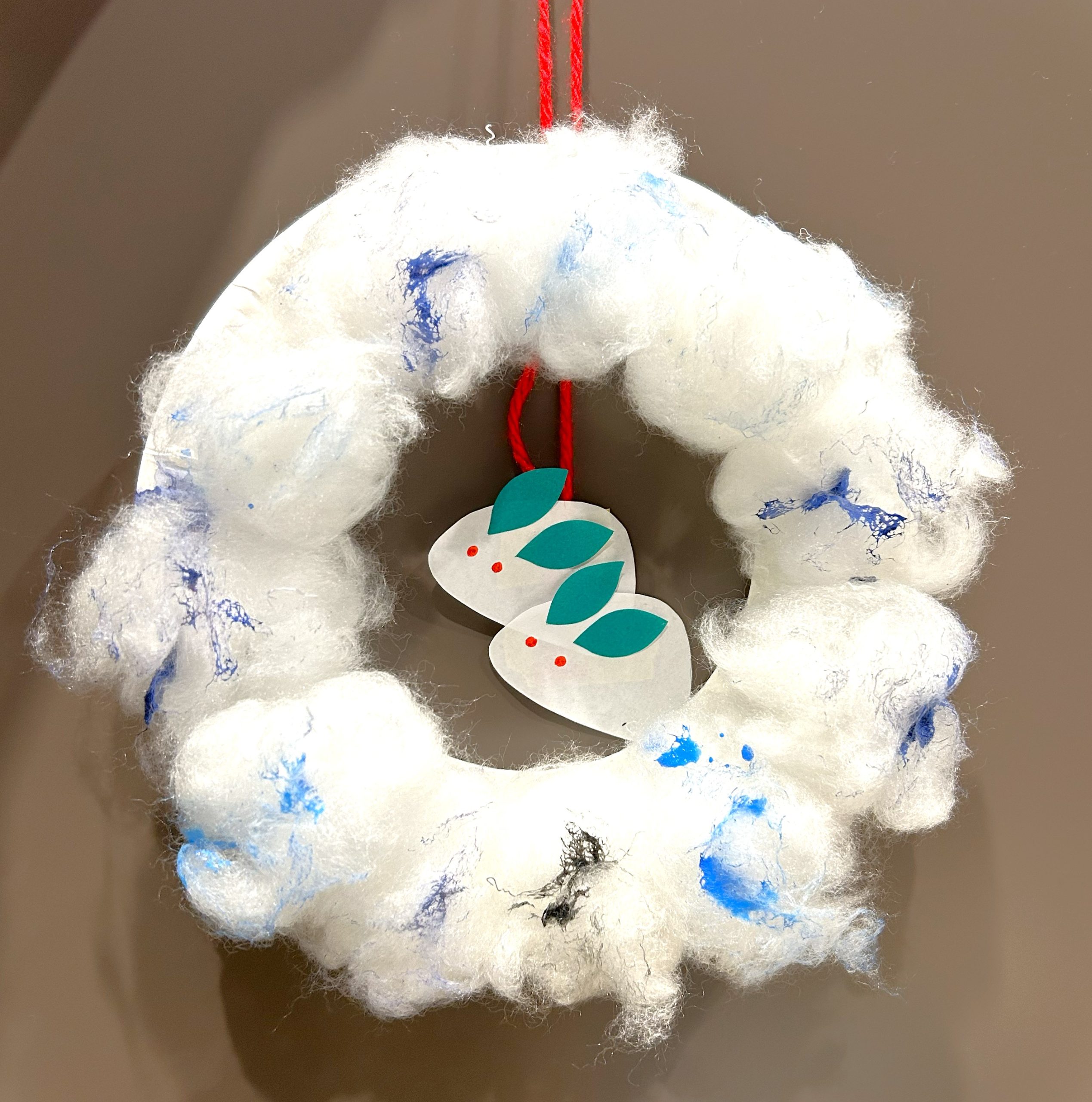 ふわふわの綿と紙皿で作るリースです。冬ならではの素材感と、仲良く寄り添うかわいらしい雪うさぎの姿から、季節感とともにほっこりするようなあたたかみも感じられます。