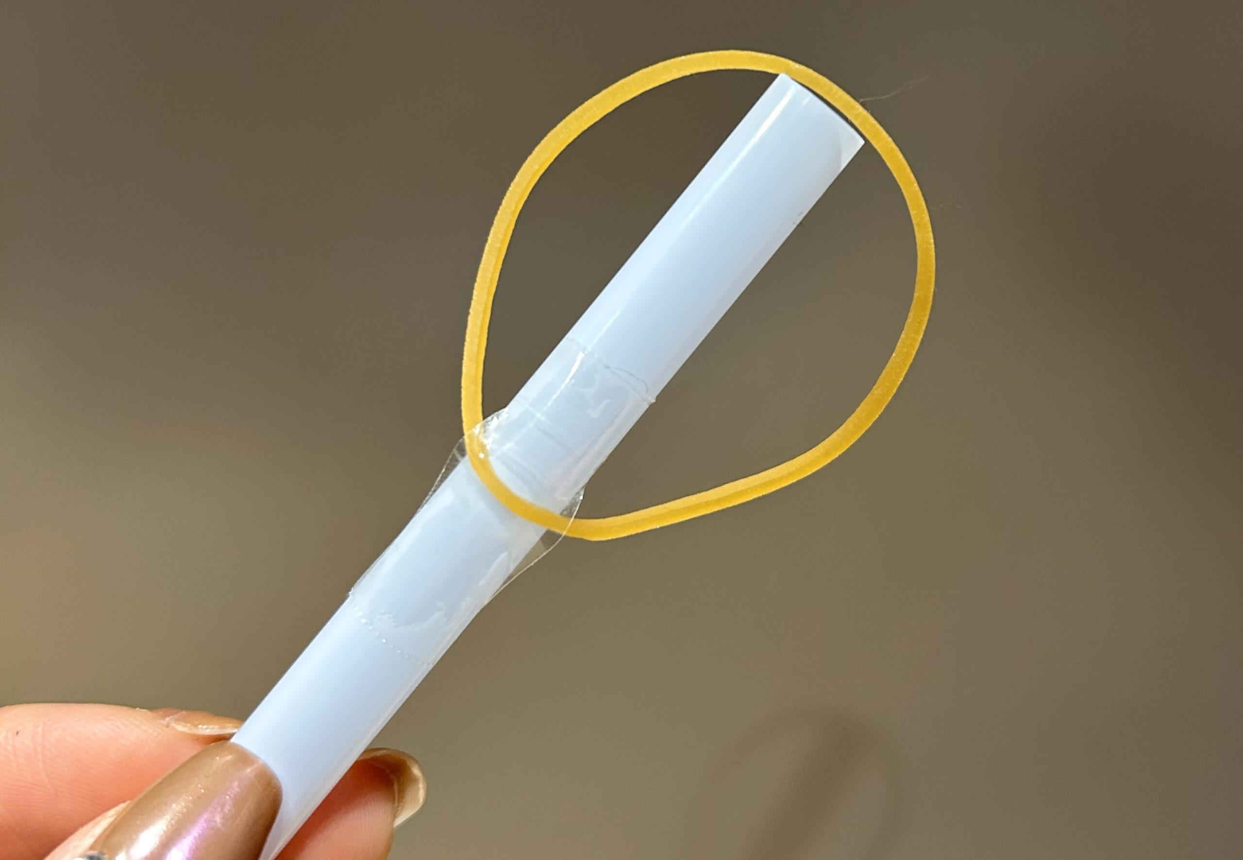 - 太いストローに輪ゴムをセロハンテープで貼り付け、細いストローの切り込みを入れていない方を、太いストローの中に入れる。