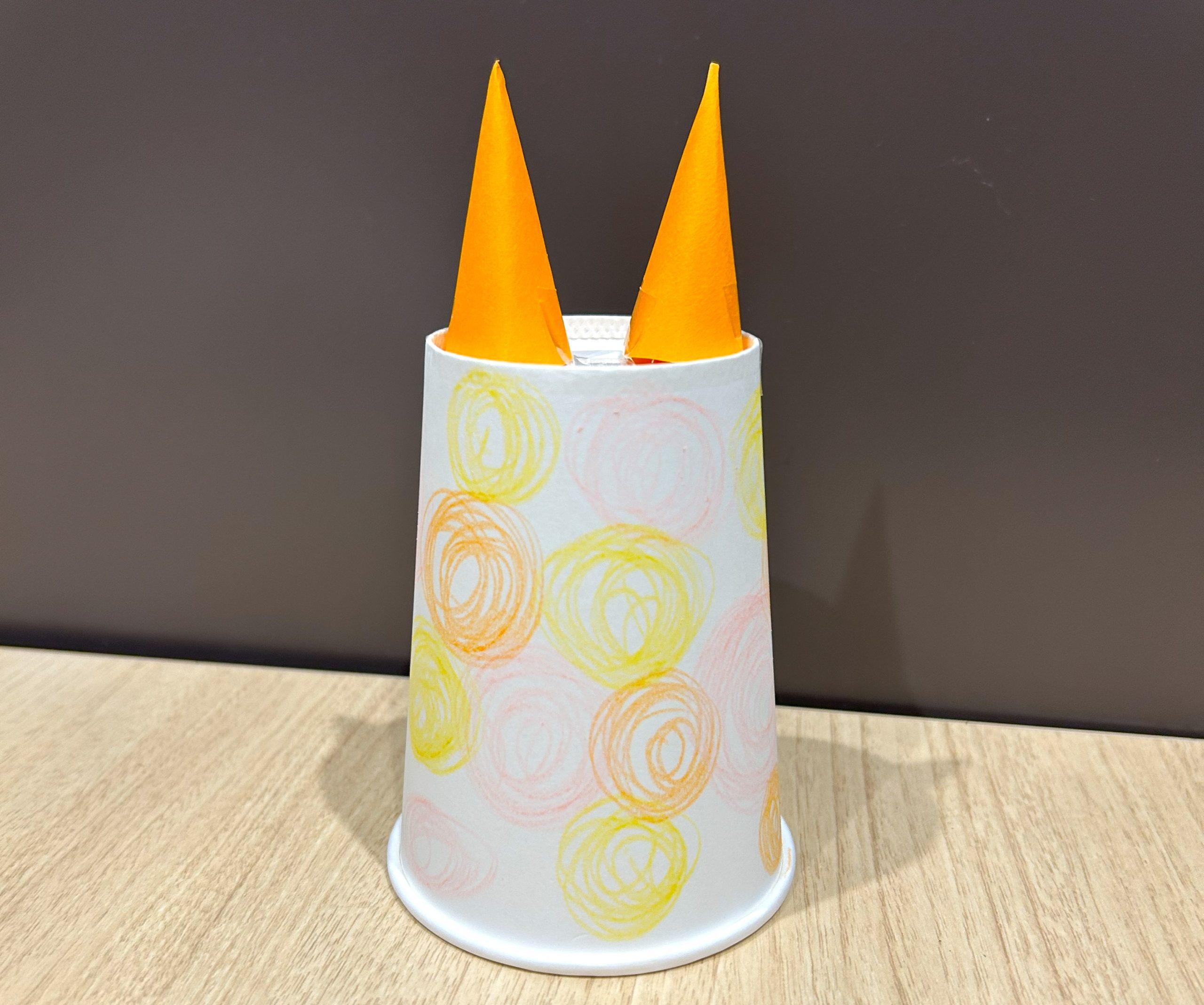 - 木工用接着剤を使って、紙コップにツノと顔のパーツを貼り付ける。