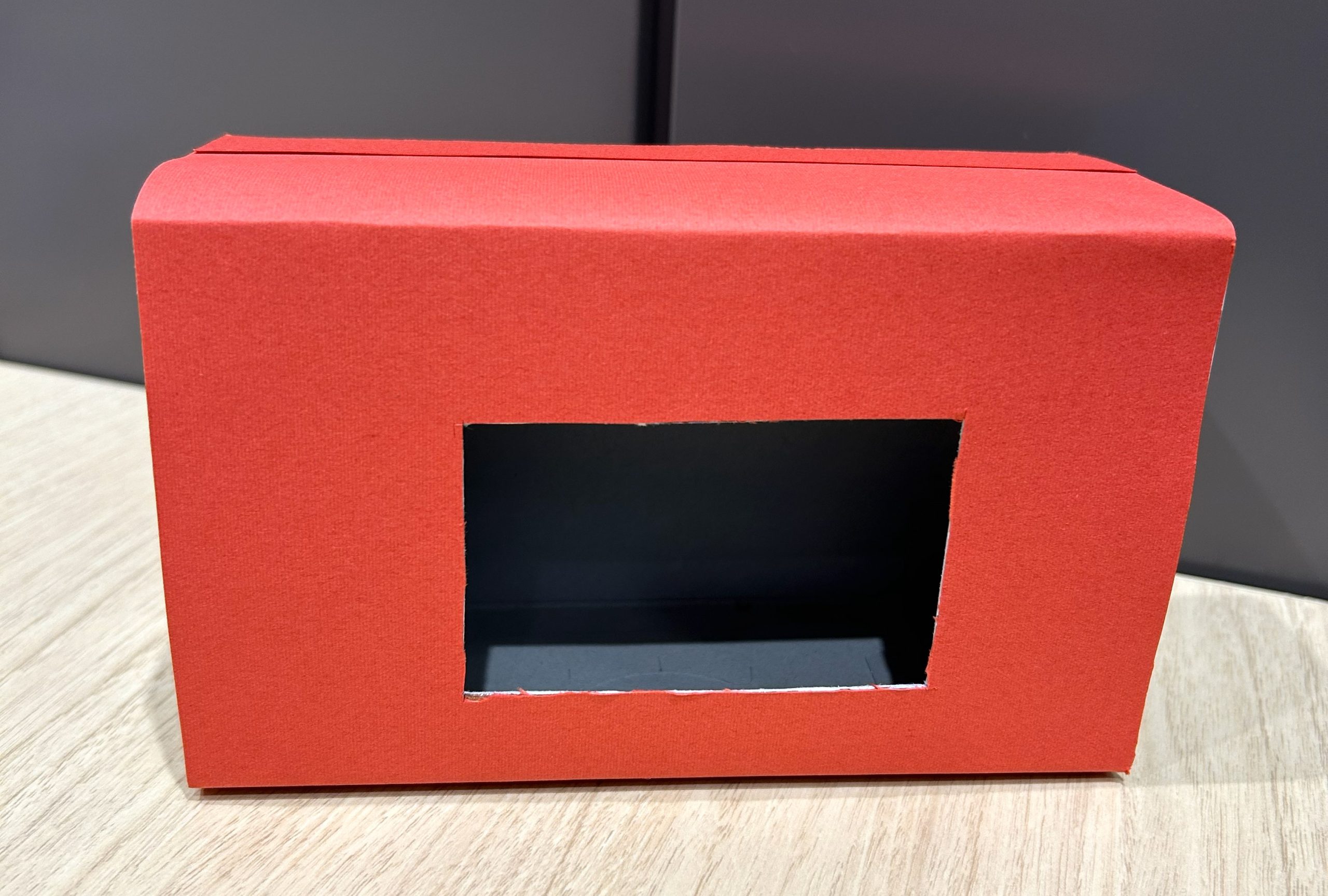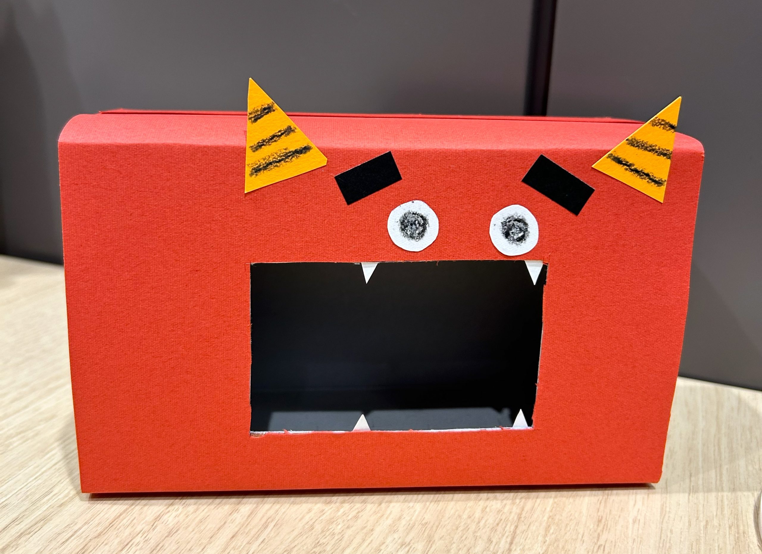 - チーズの箱に、3の鬼の顔を木工用接着剤で貼ってできあがり。