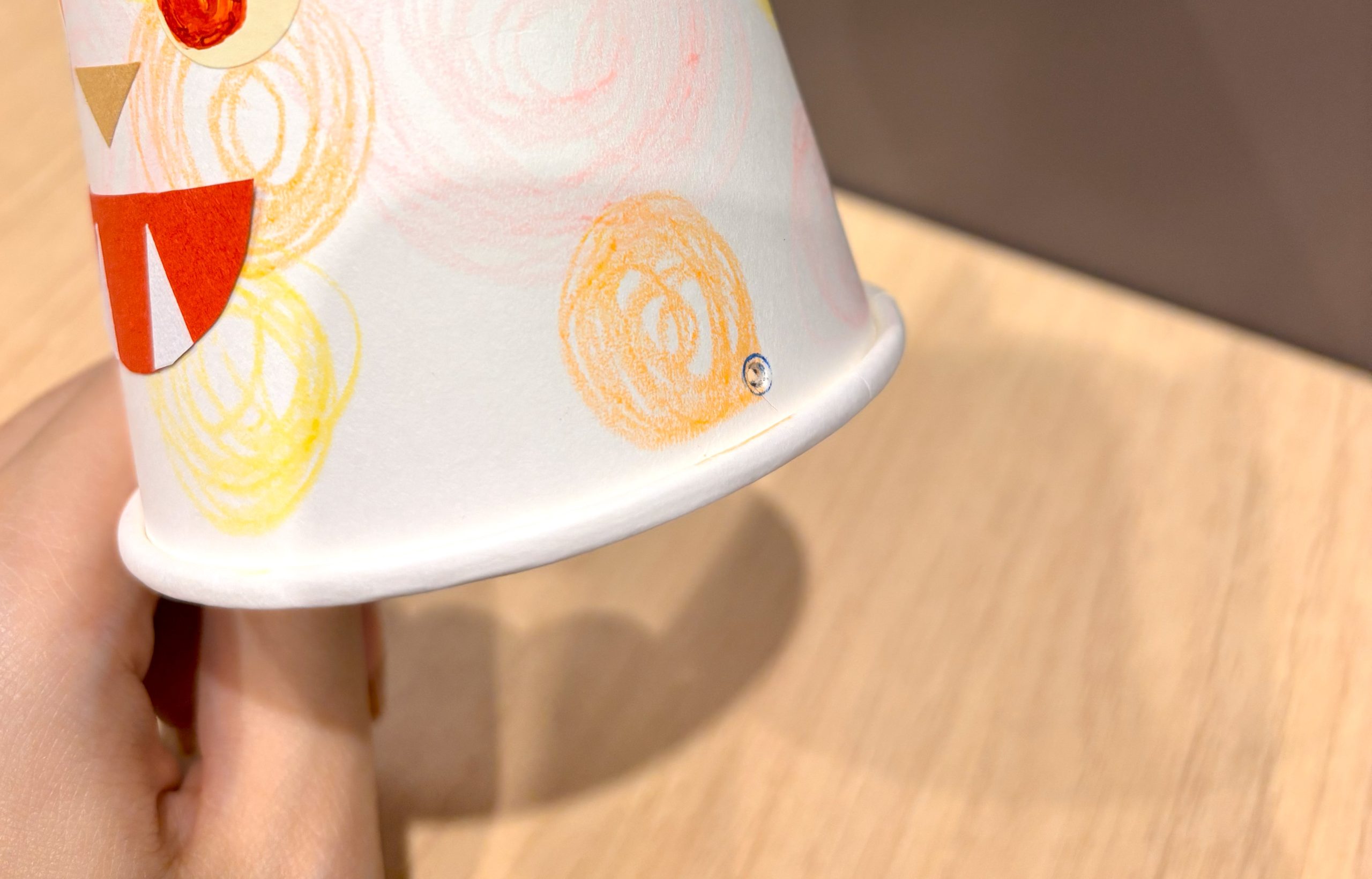 - 紙コップの飲み口側の左右に、穴あけパンチで穴をあけ、丸ゴムを通す。