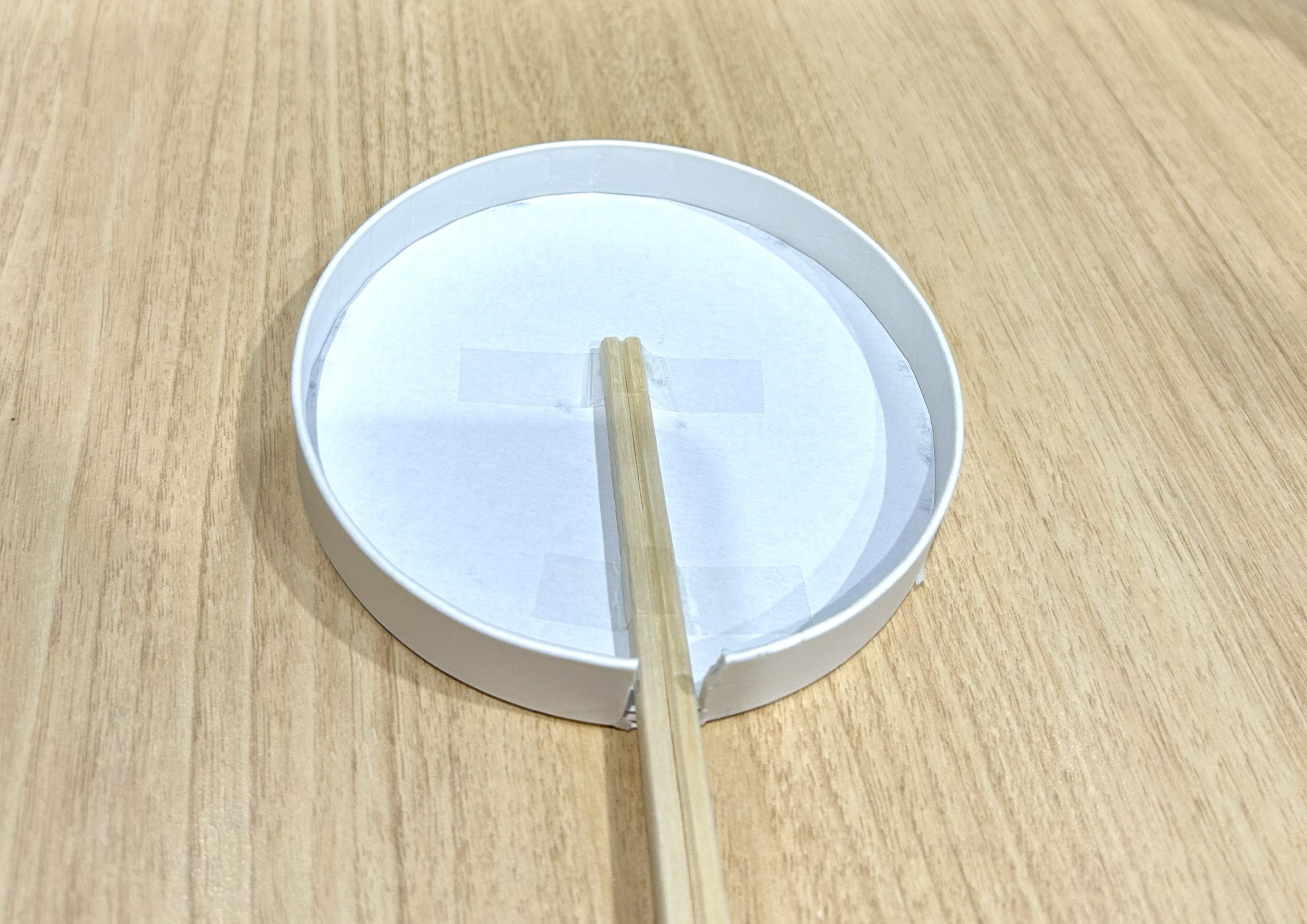- [太鼓を作る]チーズの箱のフタ・本体両方に、割りばしが入るようにはさみで切り込みを入れる。本体の切り込みに割りばしを差し込んで、セロハンテープで止める。