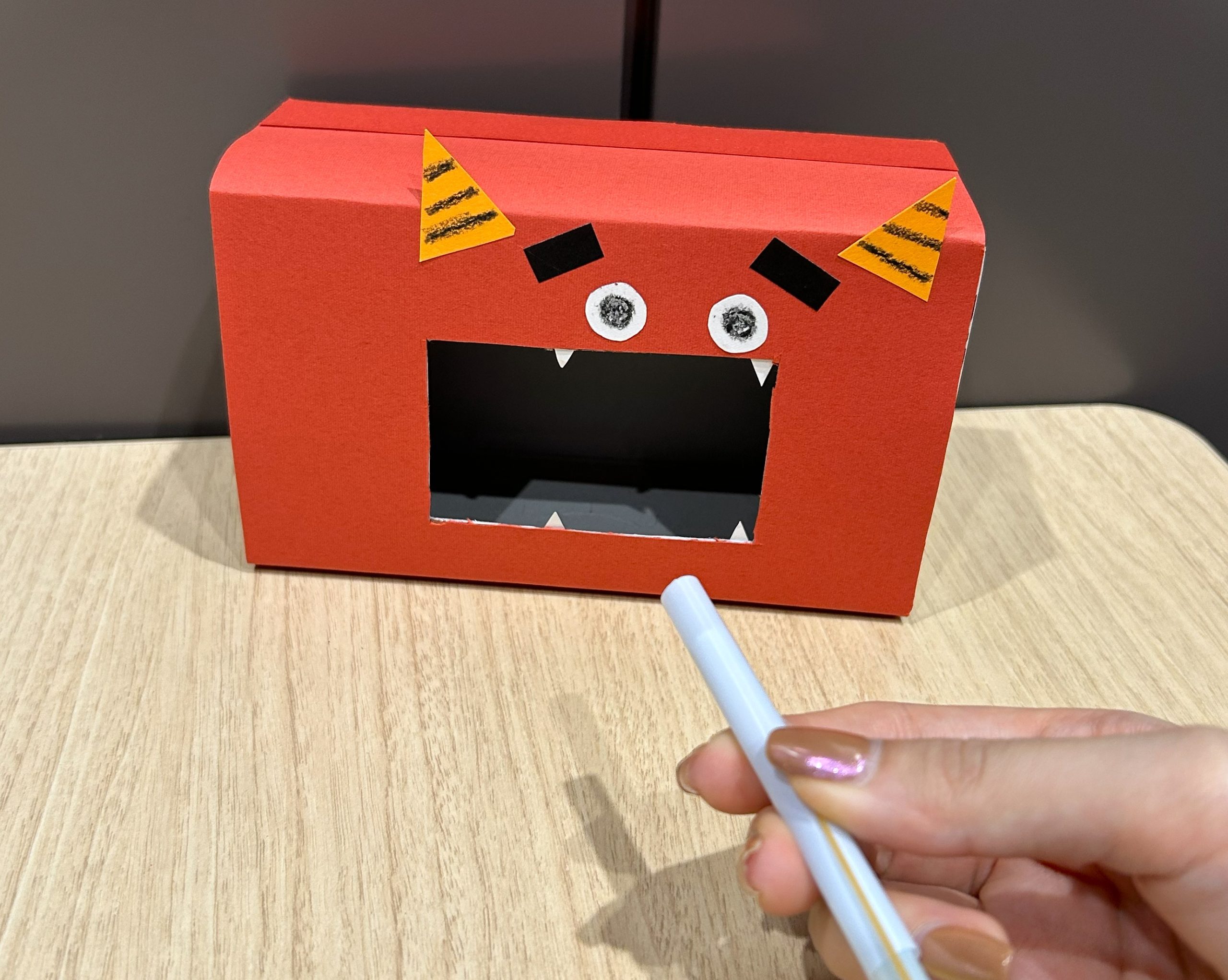 - 鬼の顔を描く前に「どんな鬼さんにしたい?」と問いかけて、イメージをふくらませるサポートを行います。自分の中の「やっつけたい気持ち」や「なりたい自分」を考える時間を作ることで、「泣き虫鬼」「怒りんぼ鬼」など感情を表す表情の描き分けにつながり、子どもが自分を見つめなおすきっかけにもなります。