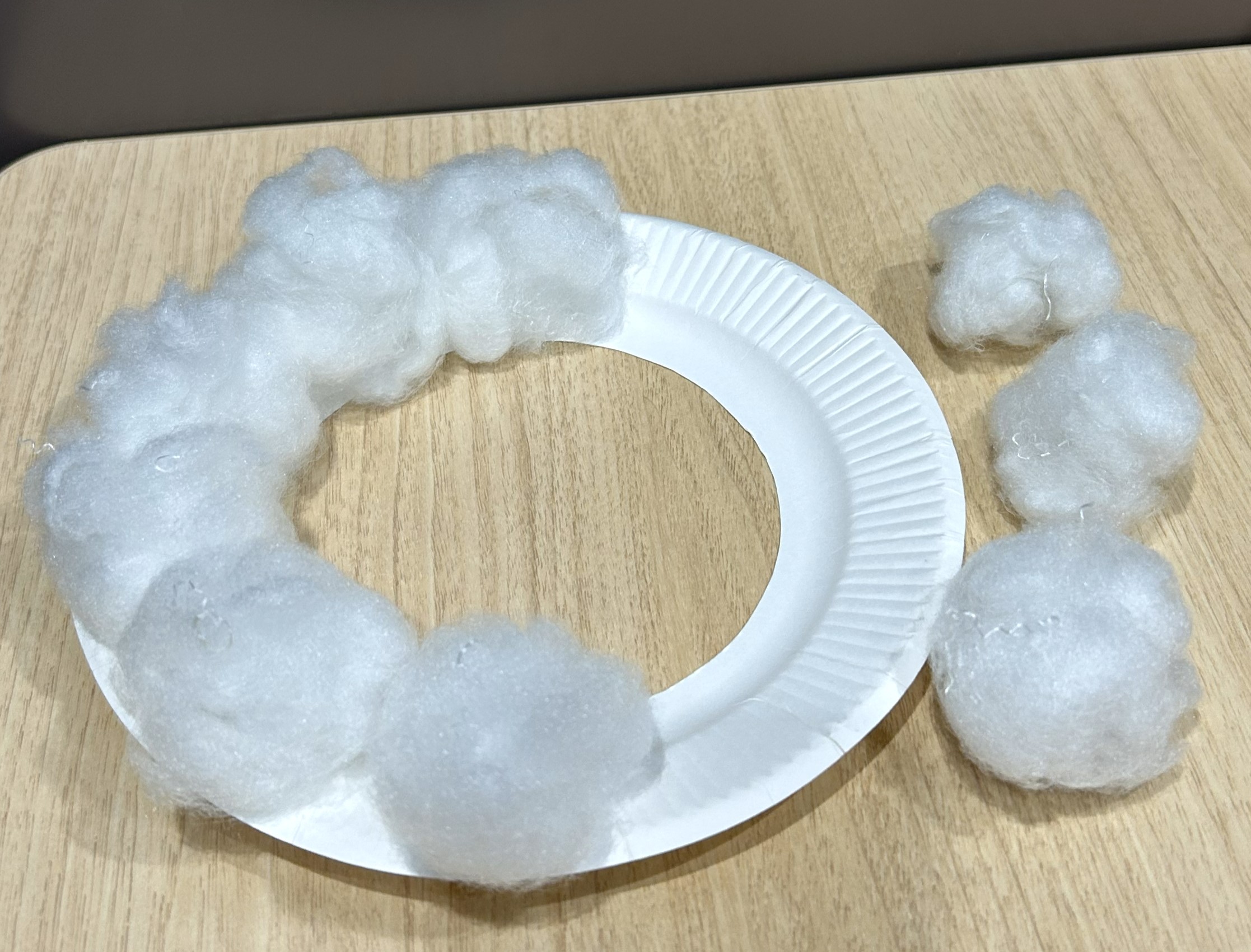- 紙皿に貼り付ける大きさに綿を丸める。木工用接着剤を紙皿に塗り、綿を貼り付ける。