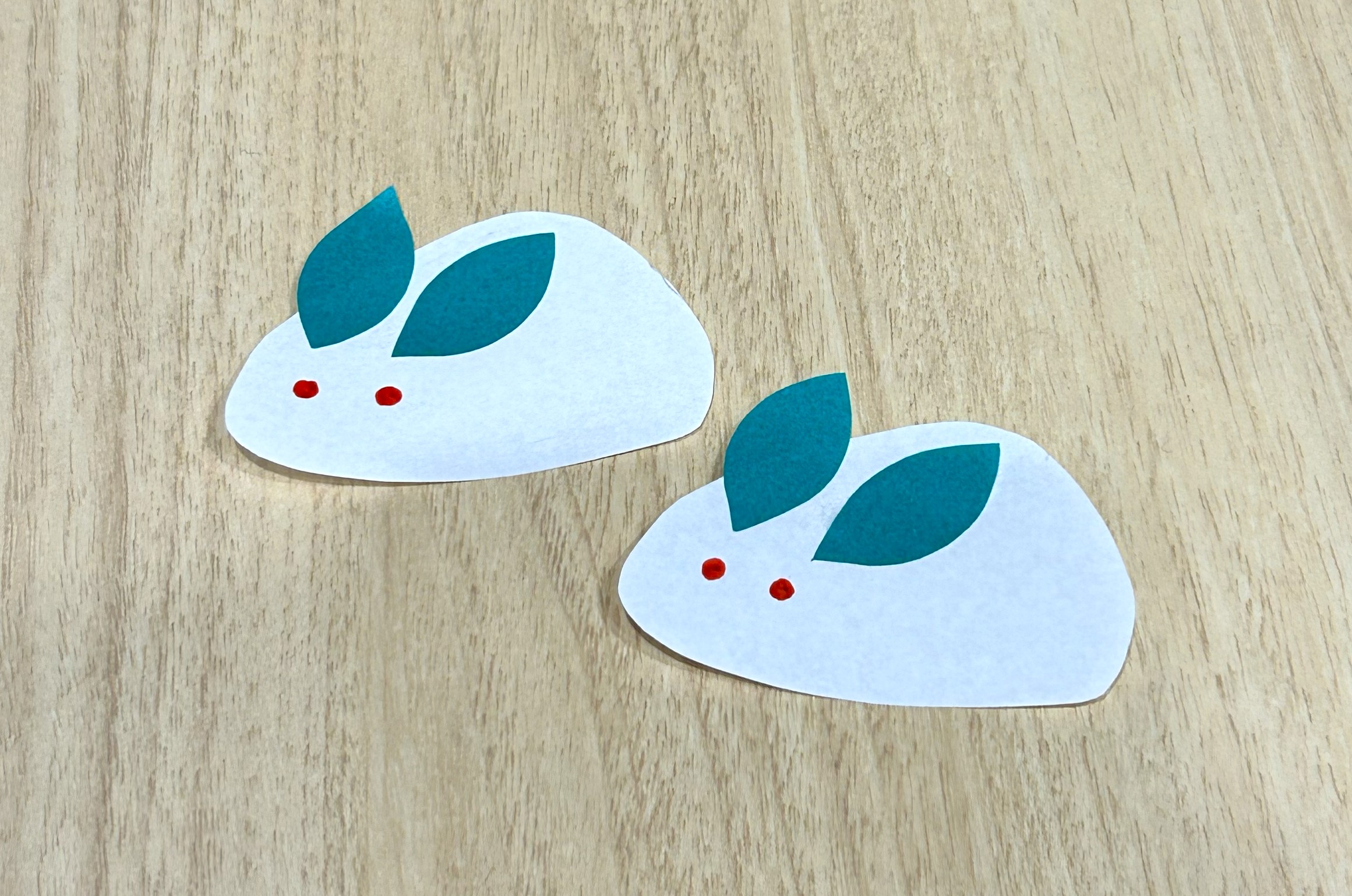 - 色画用紙(白、緑)をはさみで切り、雪うさぎのパーツを作る。パーツをのりで貼り合わせ、赤いペンで目を描き、雪うさぎのモチーフを2つ作る。