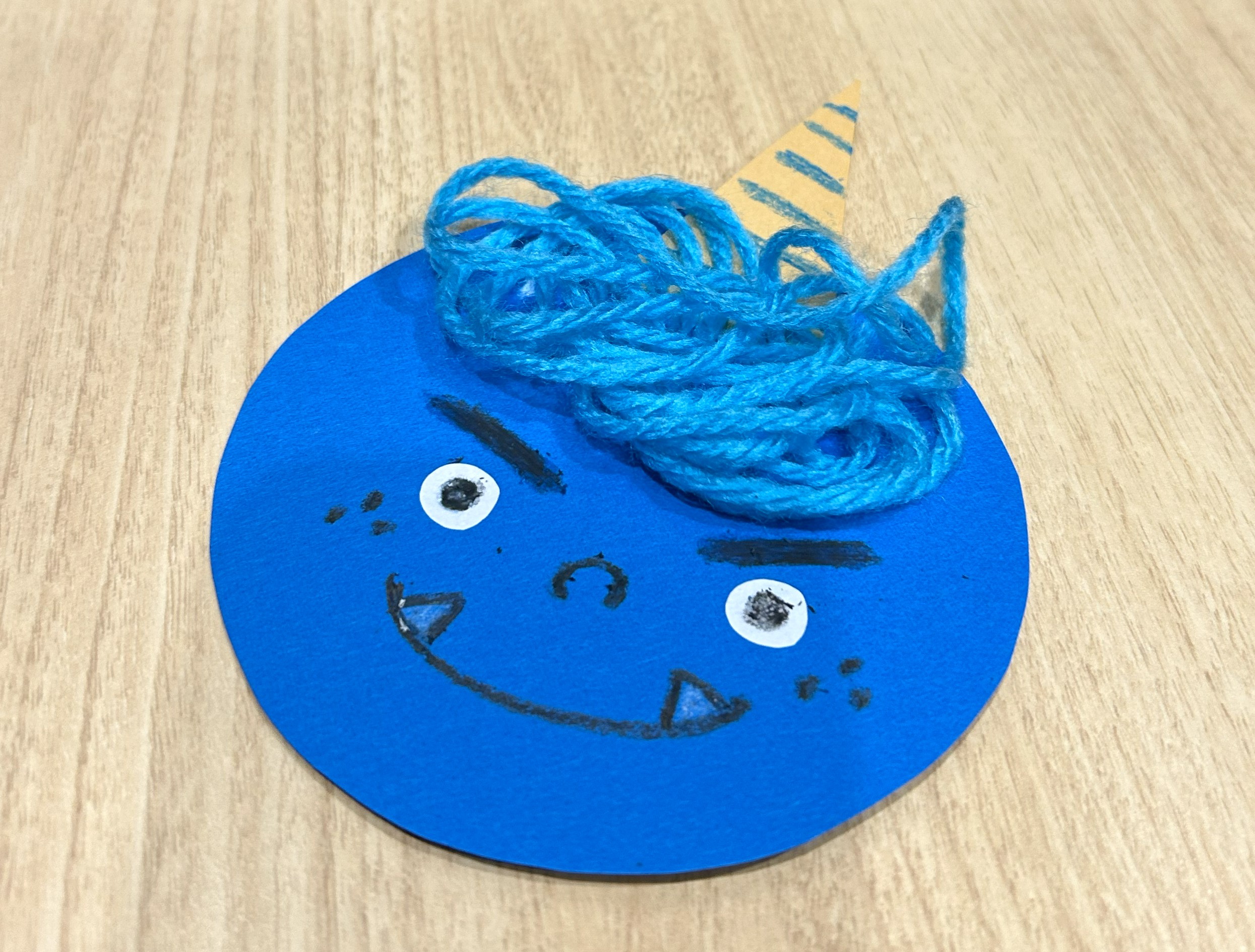 - 黄色の画用紙を鬼のツノの形に切り抜いて、黒のクレヨンで横に線を描く。1の画用紙に、ツノと髪の毛に見立てた毛糸を木工用接着剤で貼り付ける。