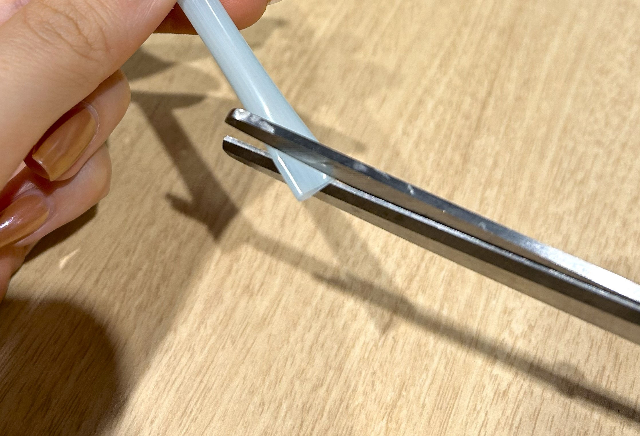 - 細いストローの端に、はさみで「V(ブイ)の字」に切り込みを入れる。