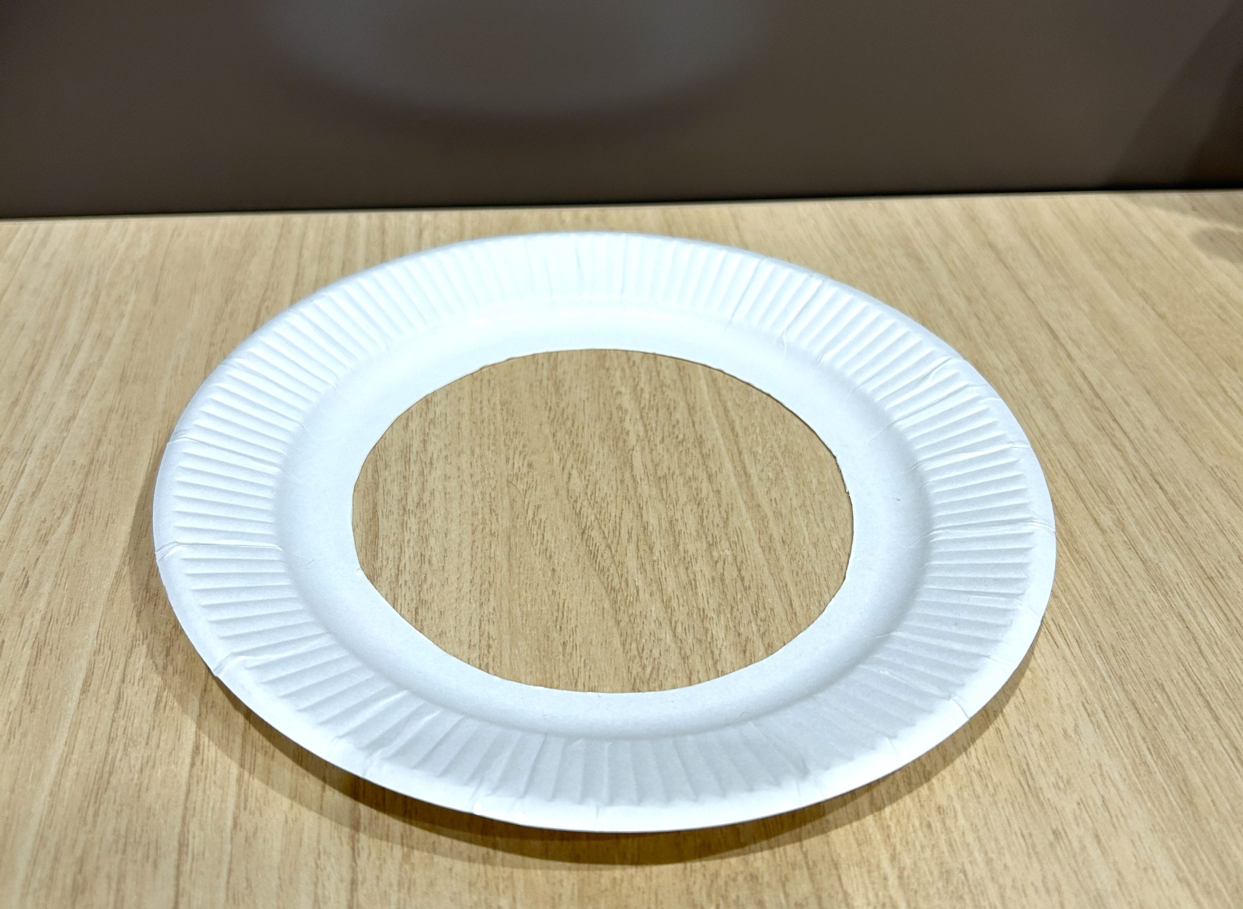 - 紙皿の中央を、リースの形になるようにカッターで切り抜く。