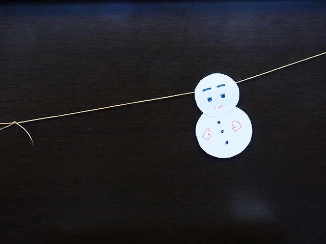 紐とストローを使った、動く雪だるまのおもちゃです。両手で持ち、雪だるまを左右に行ったり来たりさせて遊びます。