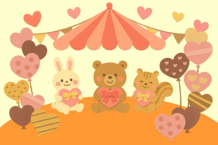ガーランドが飾られたテントの下には、うさぎ・くま・りすが大きなハートのプレゼントを抱えてにっこり。まわりに並ぶカラフルなハートの風船が、楽しいパーティーの雰囲気を盛り上げます。