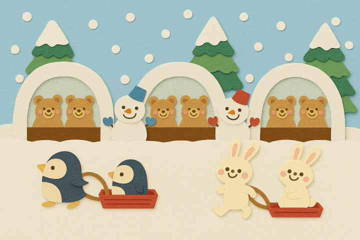 冬らしさをさらに伝えるモチーフとして、雪をかぶった木々や雪だるまたちをあしらっています。木に積もった雪の部分や雪原に綿やフェルトを使うと立体感が増し、動物たちのほっこりとした雰囲気を表現できます。そりを増やしたり、ほかの動物を乗せたり、にぎやかな壁面アレンジが楽しめます。