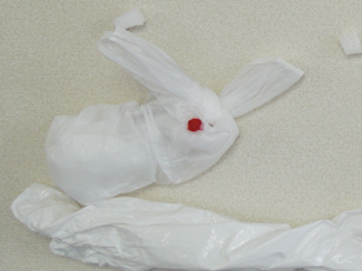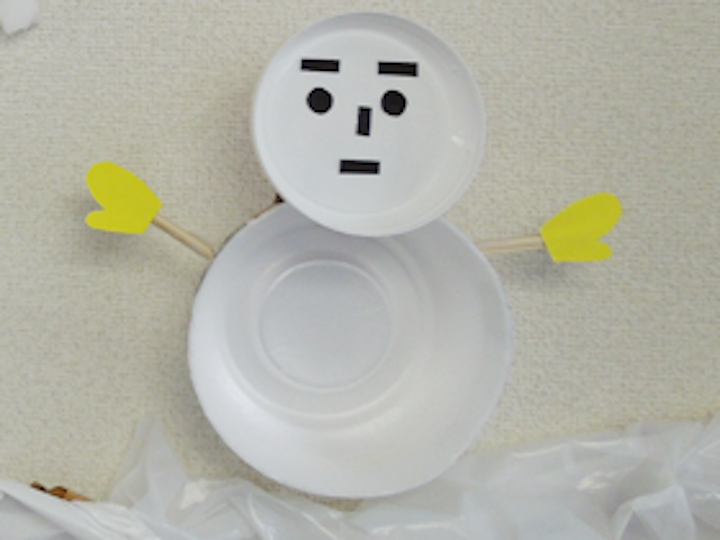 2:空き容器等は、雪だるまに変身。ビニール袋の持ち手をしばり、うさぎのように整えて、目には毛糸を利用。