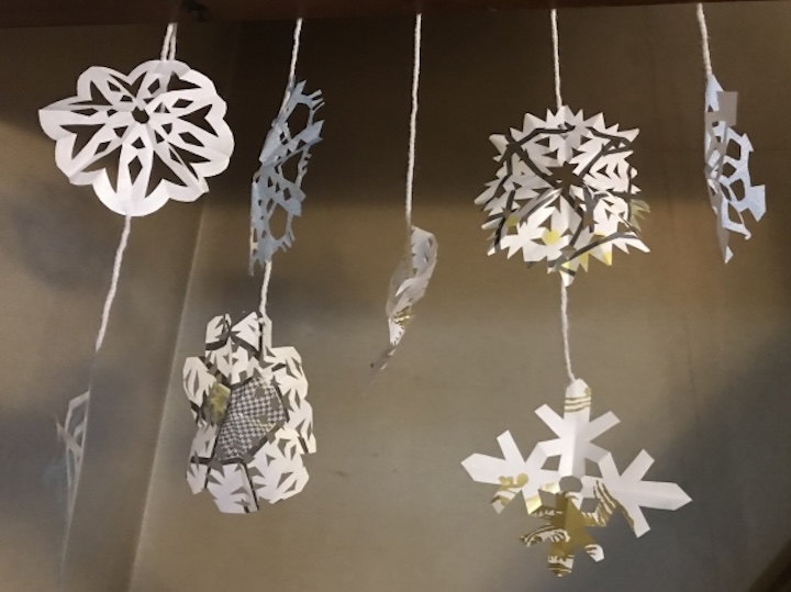 包装紙(白や銀色、金色など)を使い、小さく折りたたんで切り込みを入れると、透かし模様が美しい、雪の結晶のようなモチーフができあがります。たくさん作って壁面デザインの一部として使ったり、窓辺で上から吊るしたりして楽しみましょう。