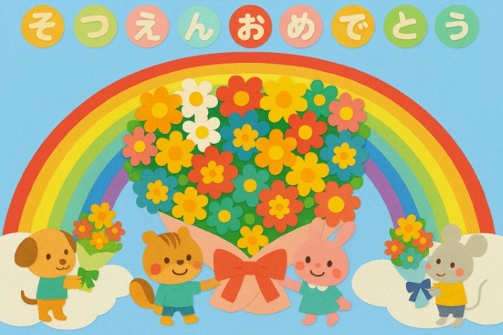 こぼれんばかりの大きな花束と、未来への希望を表すような虹、そして上部にやさしく並んだ「そつえんおめでとう」の文字が、お祝いの気持ちをまっすぐに伝えてくれるデザインです。花束のあたたかな色味や虹の曲線が、穏やかで明るい世界をつくり出し、卒園までの日々を華やかに彩ります。