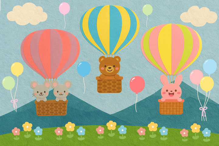 春の青空の下、色とりどりの気球に乗った動物たちが、ゆったり空の旅に出かける、明るく希望に満ちたデザインです。うさぎ・くま・ねずみたちのにこやかな表情や、ふわりと浮かぶ風船、花が咲きそろった丘など、子どもたちが親しみやすいモチーフをちりばめ、見るたびに心が弾むような楽しい雰囲気を演出しています。