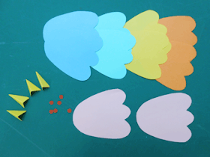 - 色画用紙で羽根、くちばし、目等のパーツを作る。