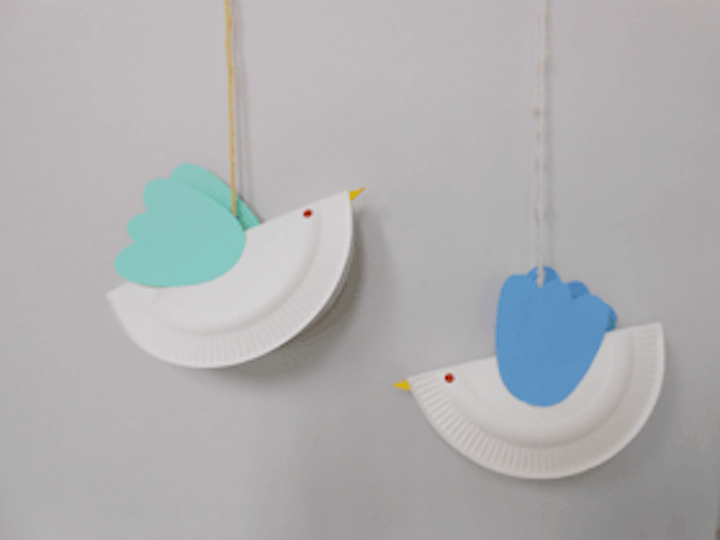 - 紙皿の折り目の内側に、くちばしを貼る。目や羽根を貼り、ひもを付ける。