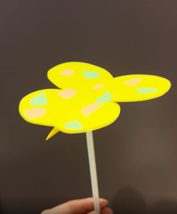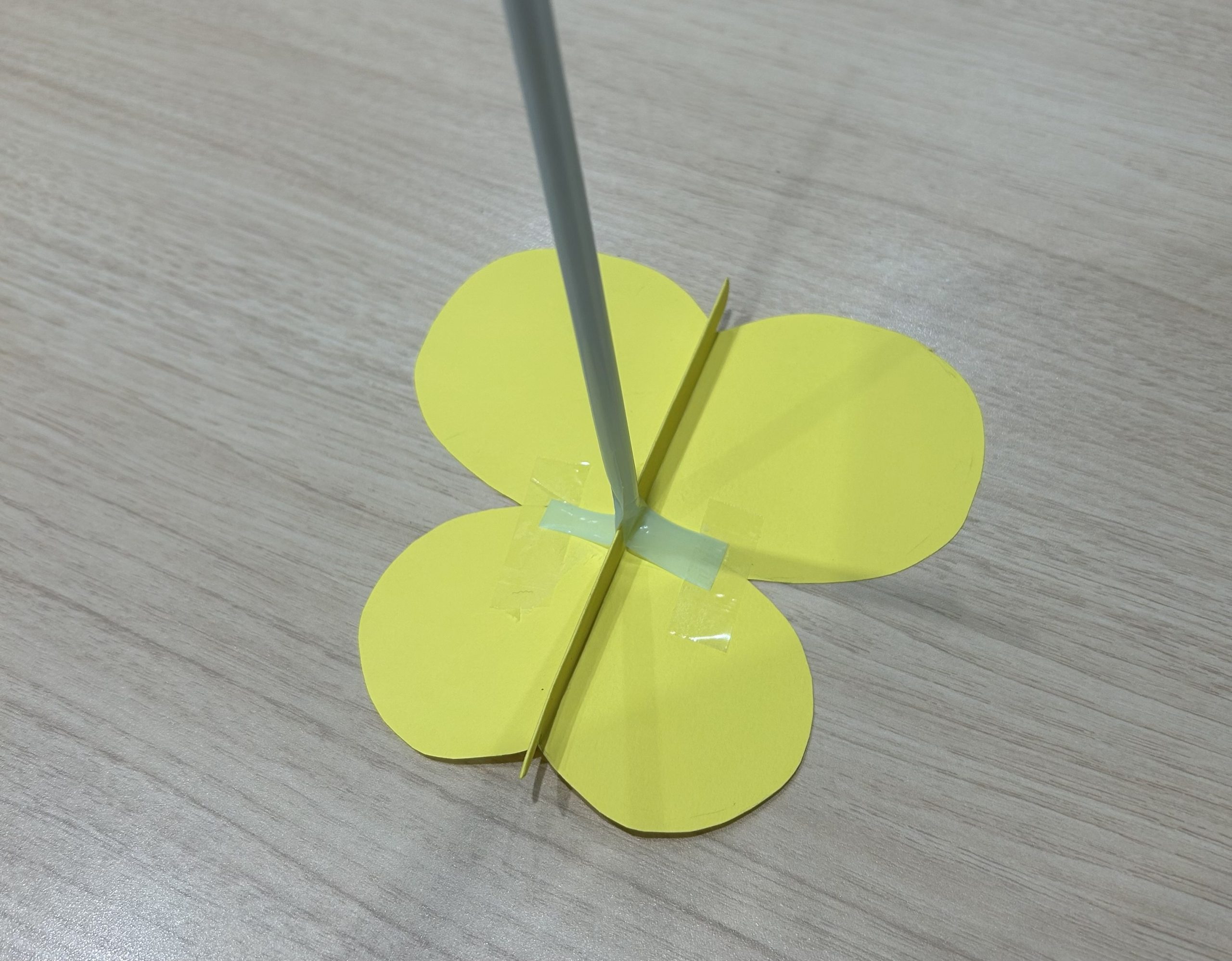 - 竹串にストローを通し、切り込みを入れた部分を羽の裏にセロハンテープで貼り付ける。