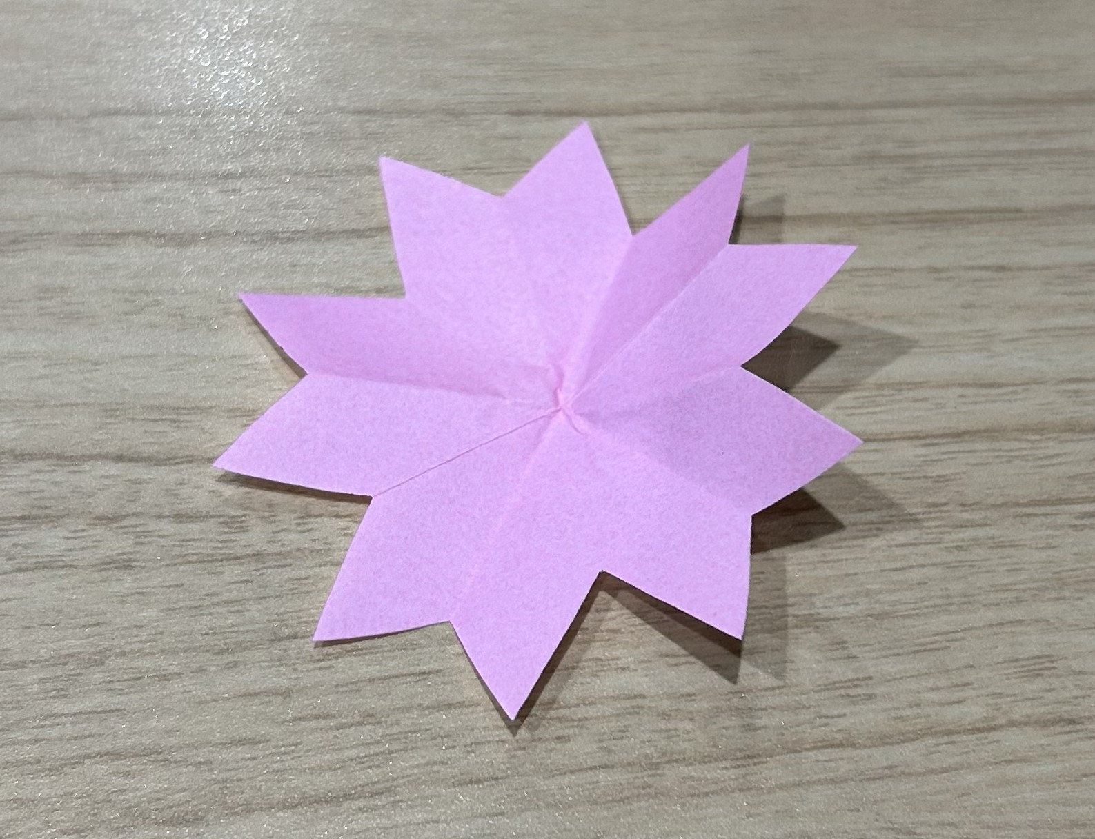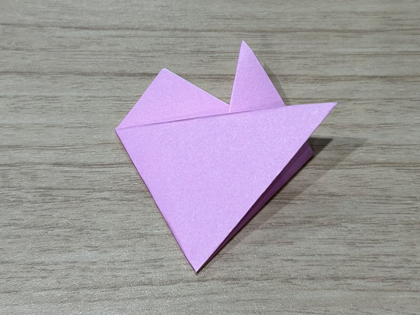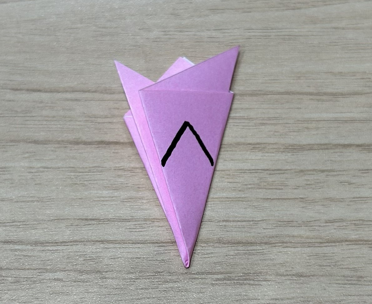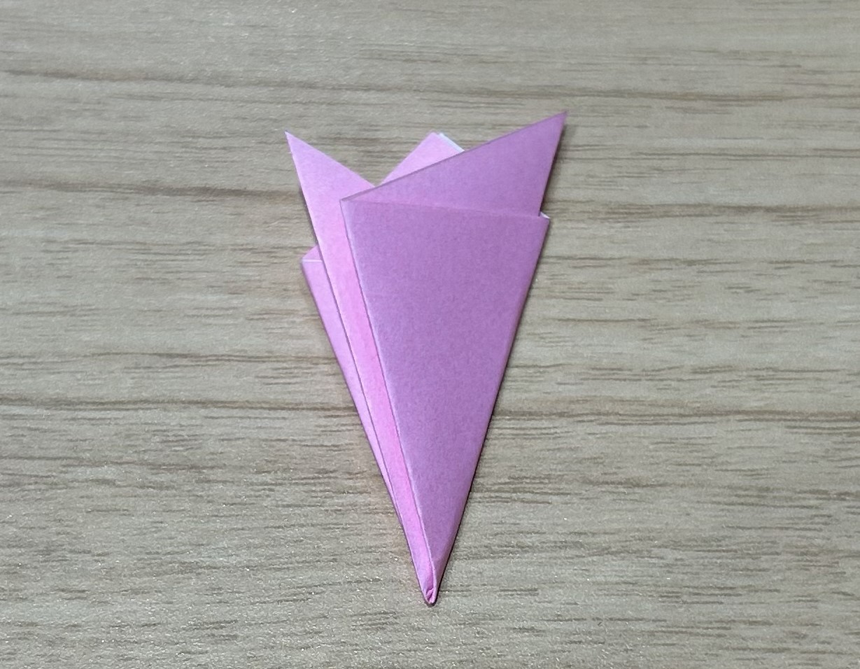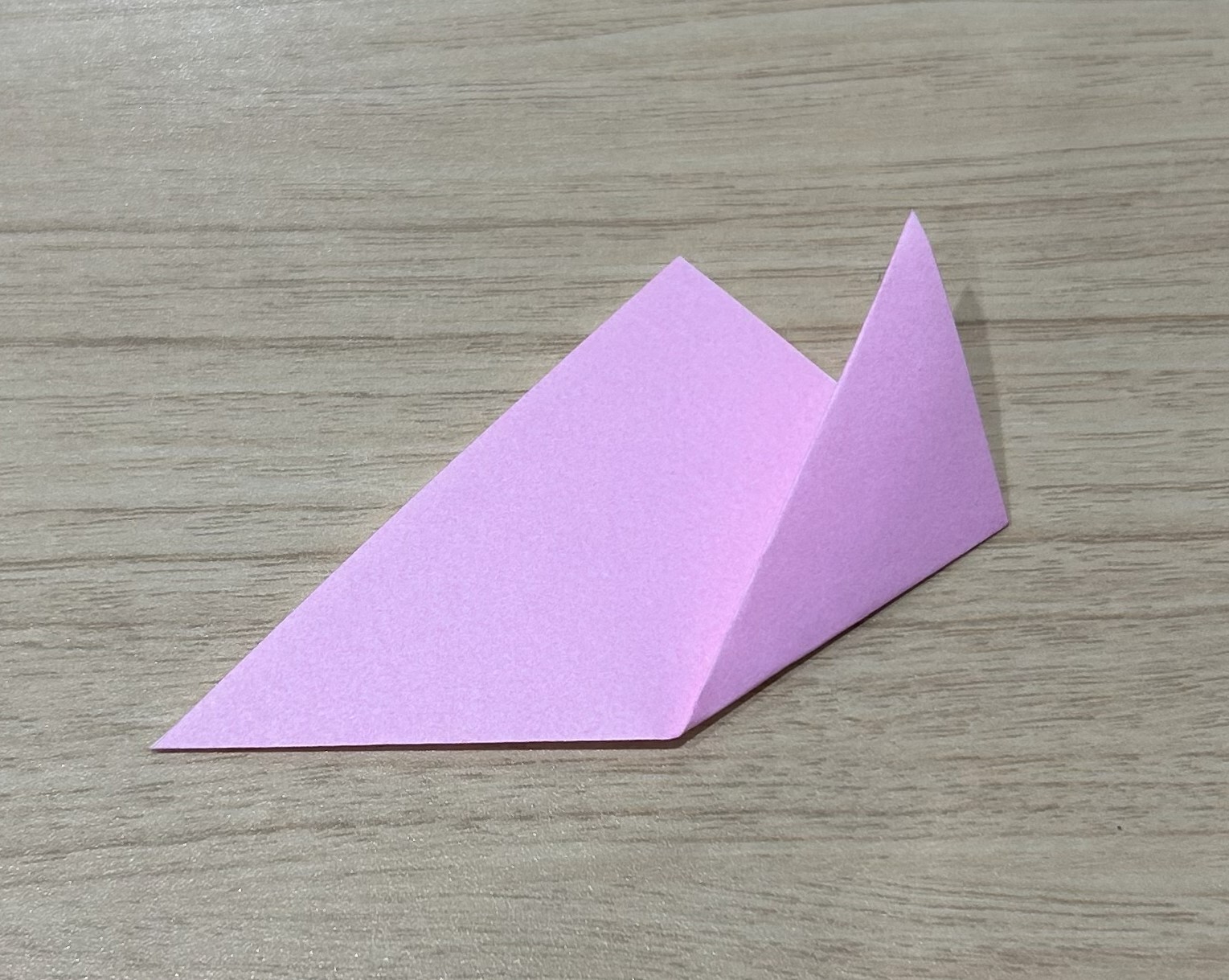 - [桜のモチーフを作る]折り紙を三角に折り、右の角を折り上げる。