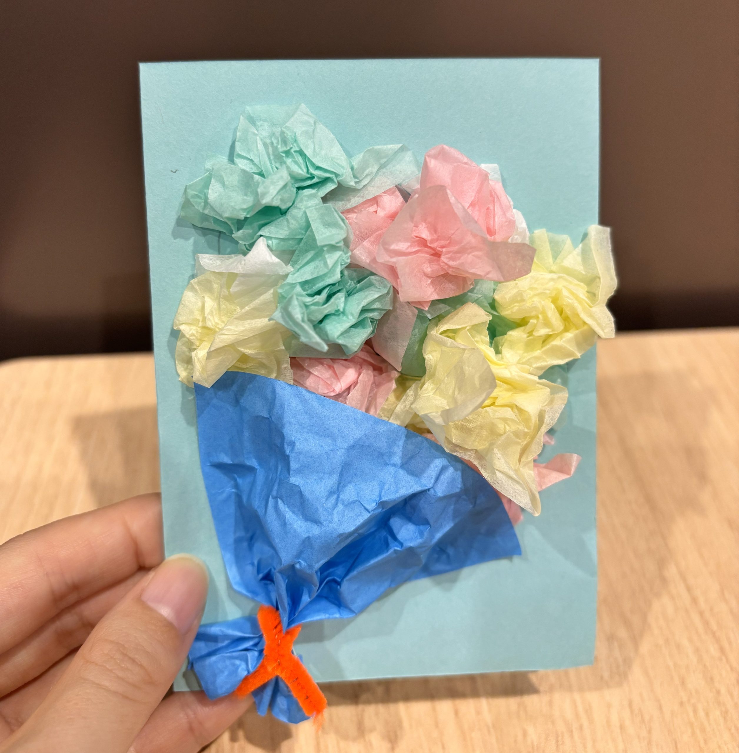 「どんな色のお花にしよう?」「なんて言葉を届けよう?」と考えながら取り組むことで、子どもたちが自然と自分の気持ちと向き合い、伝える喜びを味わえる製作です。