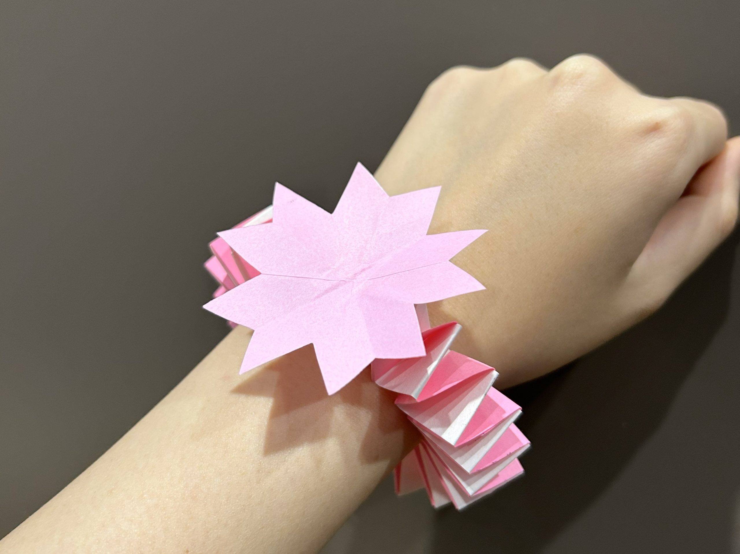 - 色画用紙の色合わせを変えたり、桜のモチーフを重ねたり、自分なりのアレンジに発展させることもできます。「どんな春のブレスレットにしたい?」と問いかけることで、表現の幅が広がります。