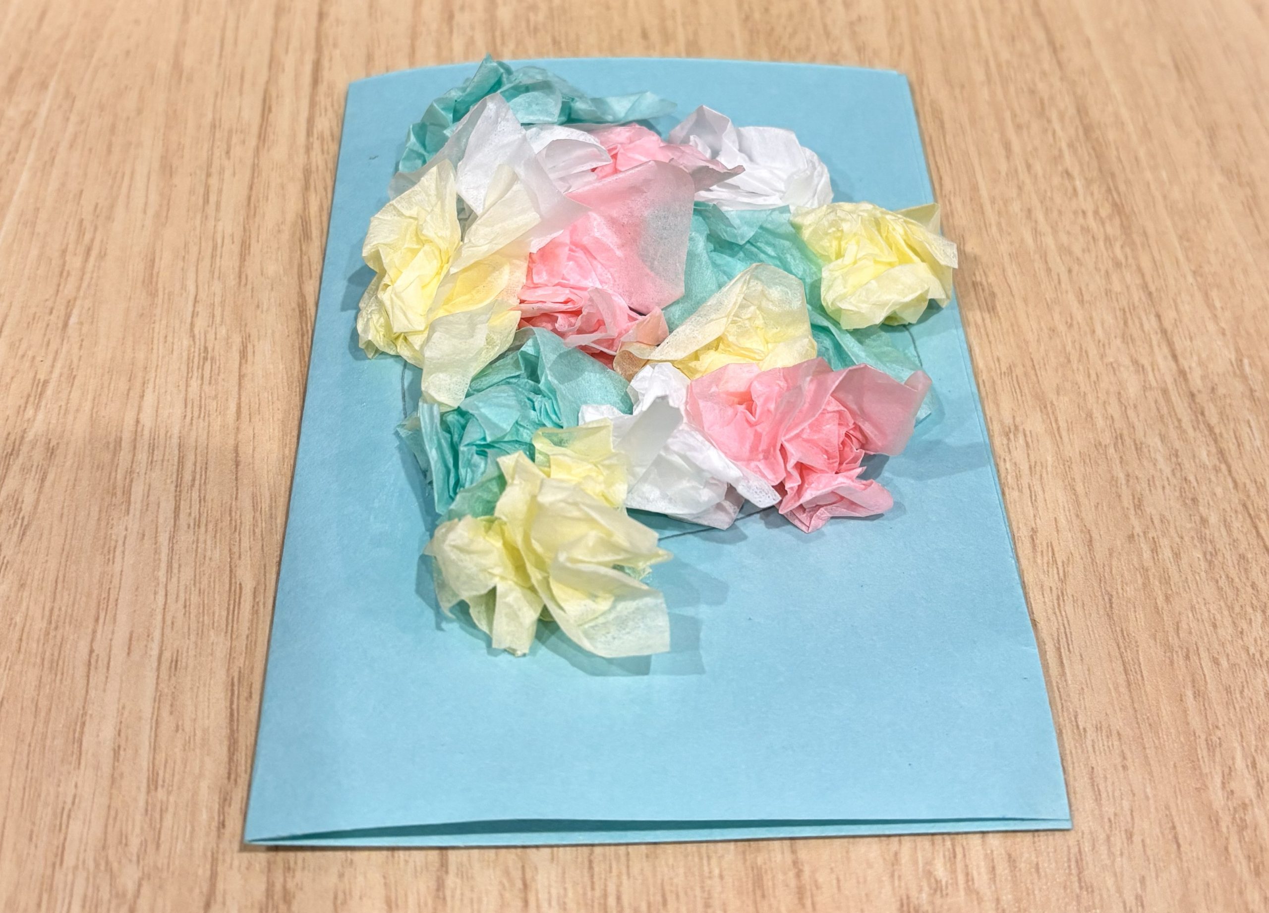- お花紙を丸めたり、不織布をやさしく整えたりする動作は指先の細かい調整が必要なため、最初に保育士が見本を見せて「そっと丸めるよ」「ふわっとのせてみようね」と声をかけながら進めると取り組みやすくなります。