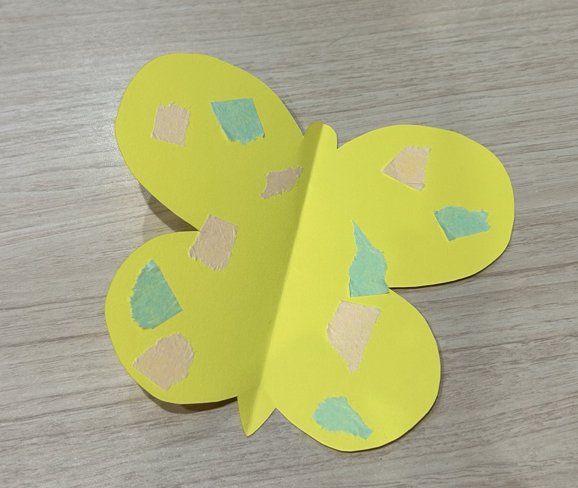 - 折り紙をちぎり、左右の羽にのりで貼り付ける。