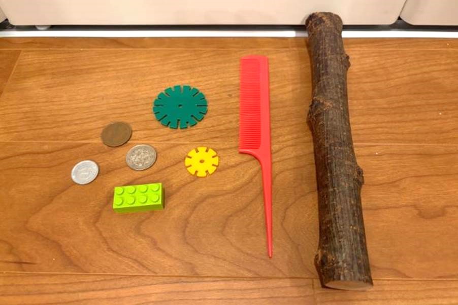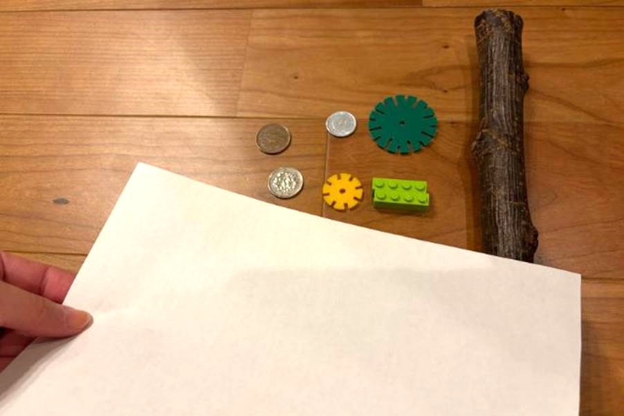 画用紙(コピー用紙が薄くて写りやすい)、色鉛筆またはクレヨン、凹凸のある素材(例:小枝・コイン・レース・ブロック・クシ など好きなもの)