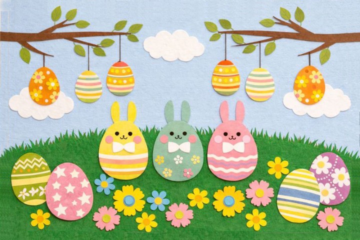 イースターに行われる「エッグハント」にちなんで、くさむらの中にたまごを隠すような、遊び心のあるアレンジも楽しめます。うさぎやたまごの大きさを変えたり、模様を子どもたちの製作で表現したりすれば、クラスごとの個性が光る壁面デザインになることでしょう。