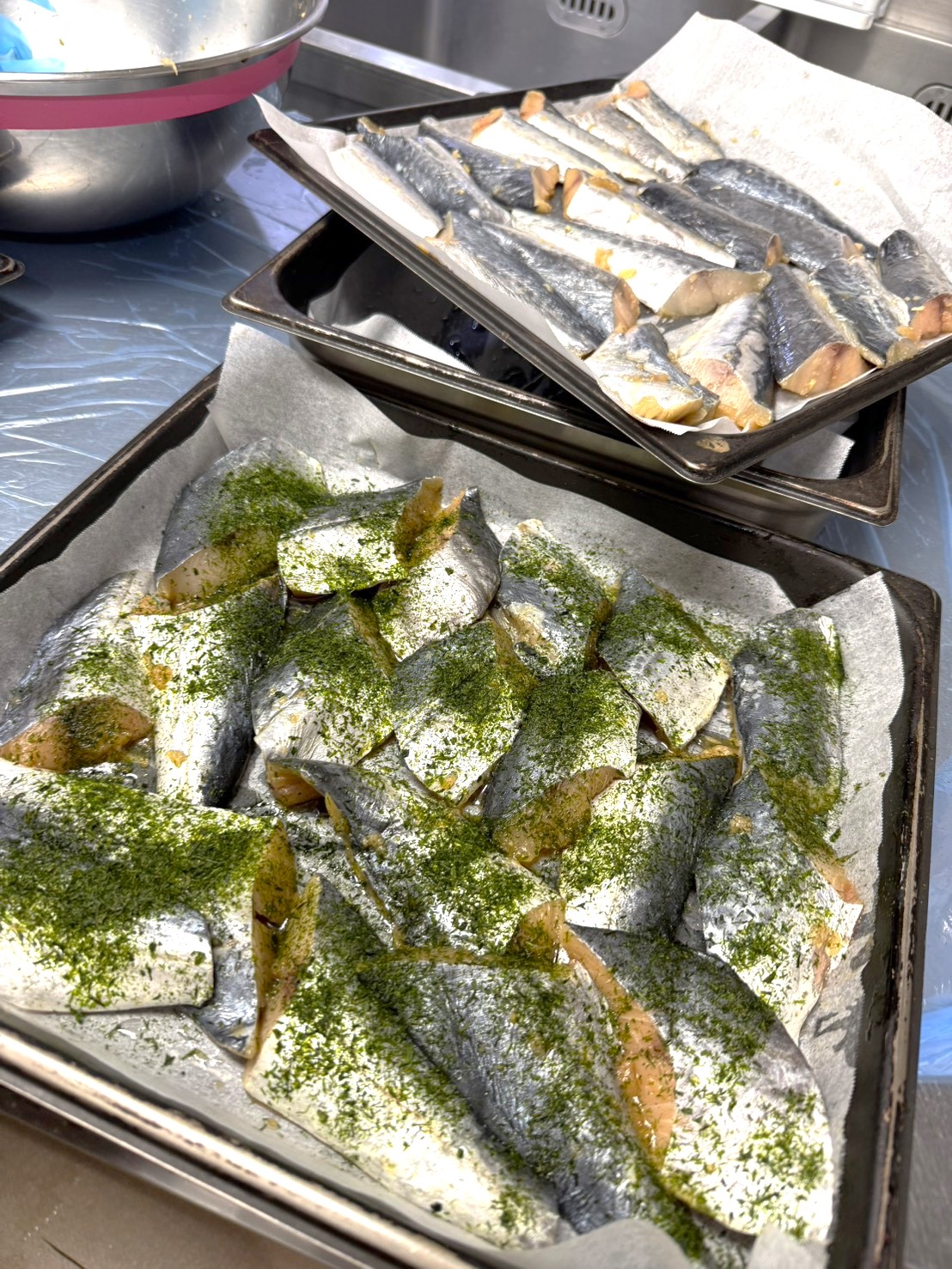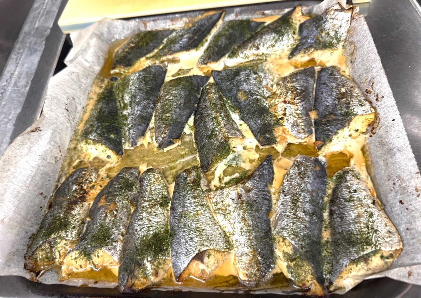 - サワラを醤油、みりん、酒で漬け込み、クッキングシートを広げた鉄板に並べる。オーブンを200℃で予熱しておく。